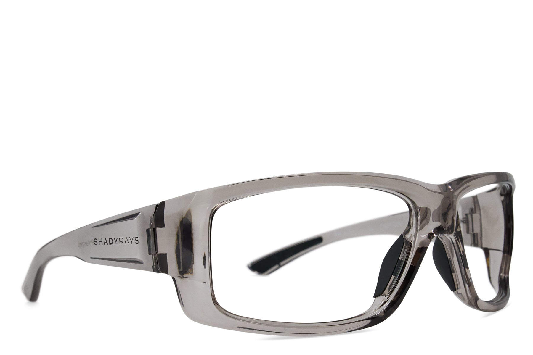 Translucent smoke grey TR-90 wrap frame with raised logos. complete with prescription lenses custom-made for you in our US-based optical lab. Includes signature hard case.