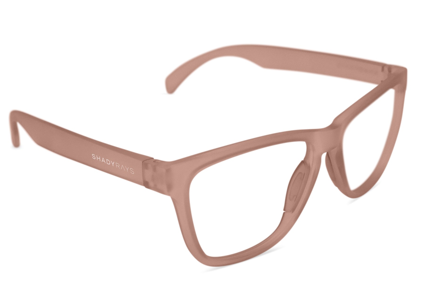 A versatile. transparent peach frame for active or casual use. with rubber nosepieces and snap hinges. complete with prescription lenses custom-made for you in our US-based optical lab. Includes signature hard case.