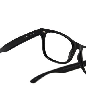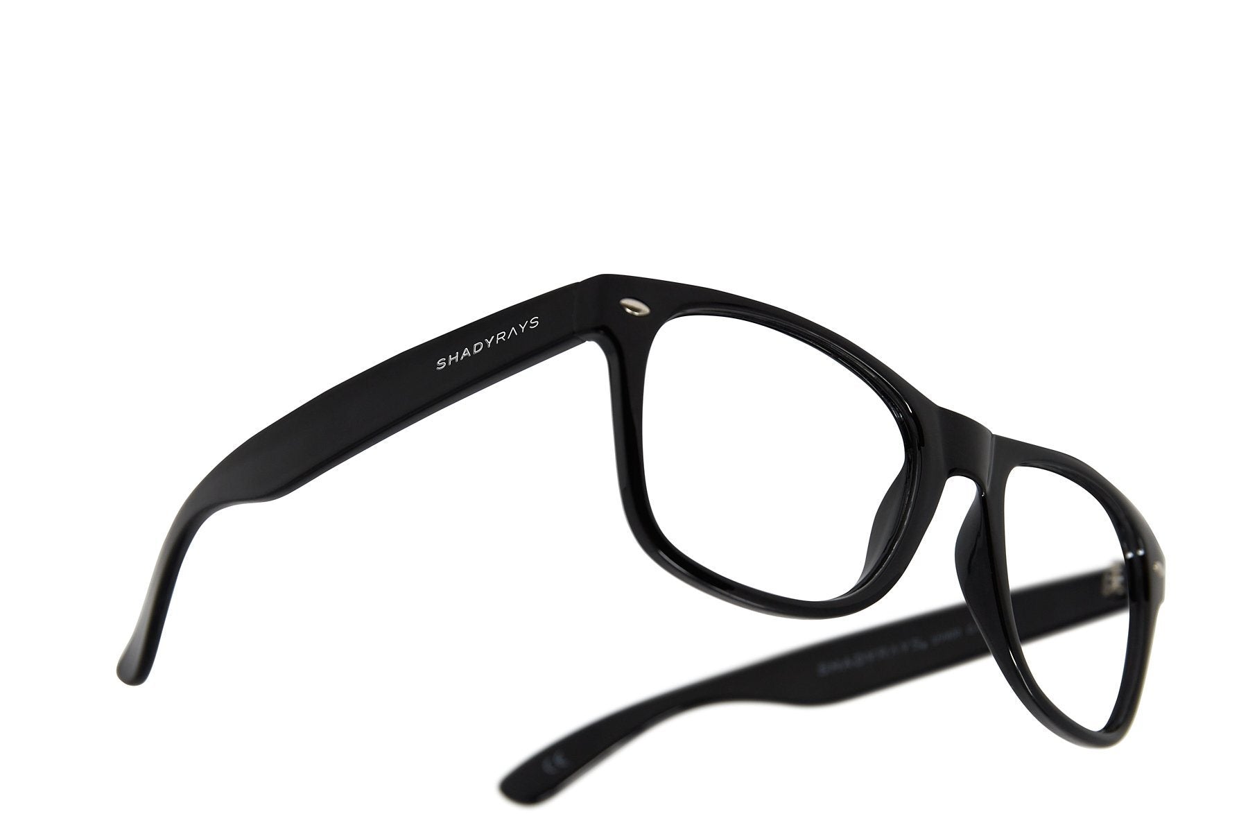 Gloss black frame with polished metal hinges and metal Shady Rays emblem. complete with prescription lenses custom-made for you in our US-based optical lab. Includes signature hard case.