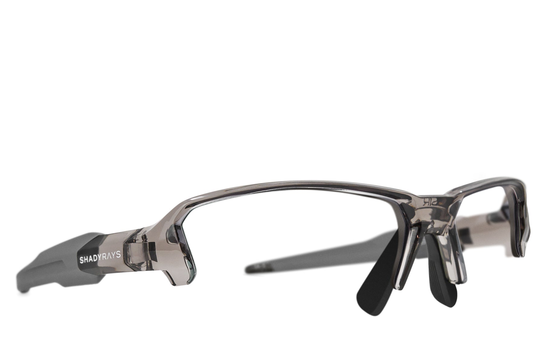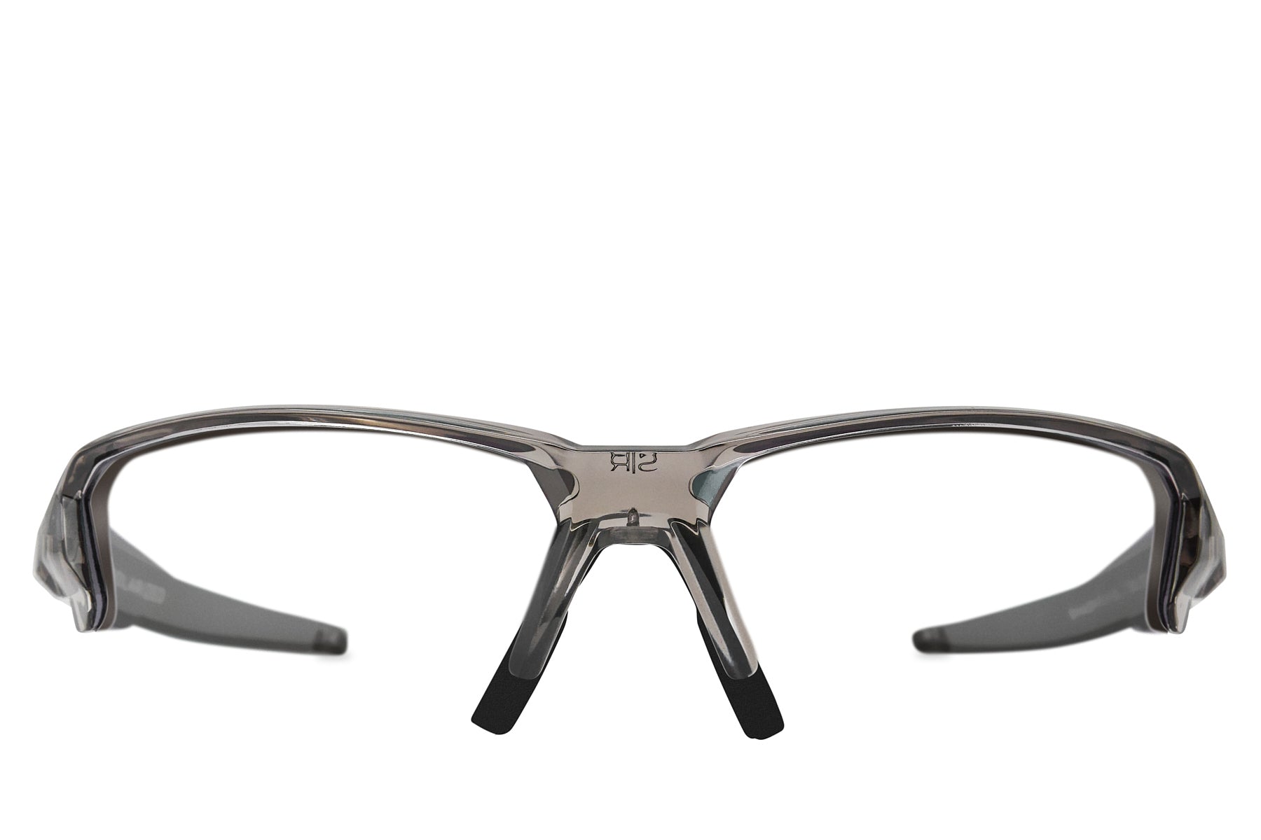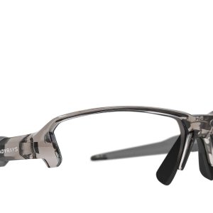 Translucent grey smoke TR-90 sport frame with raised logos. complete with prescription lenses custom-made for you in our US-based optical lab. Includes signature hard case.