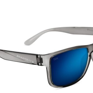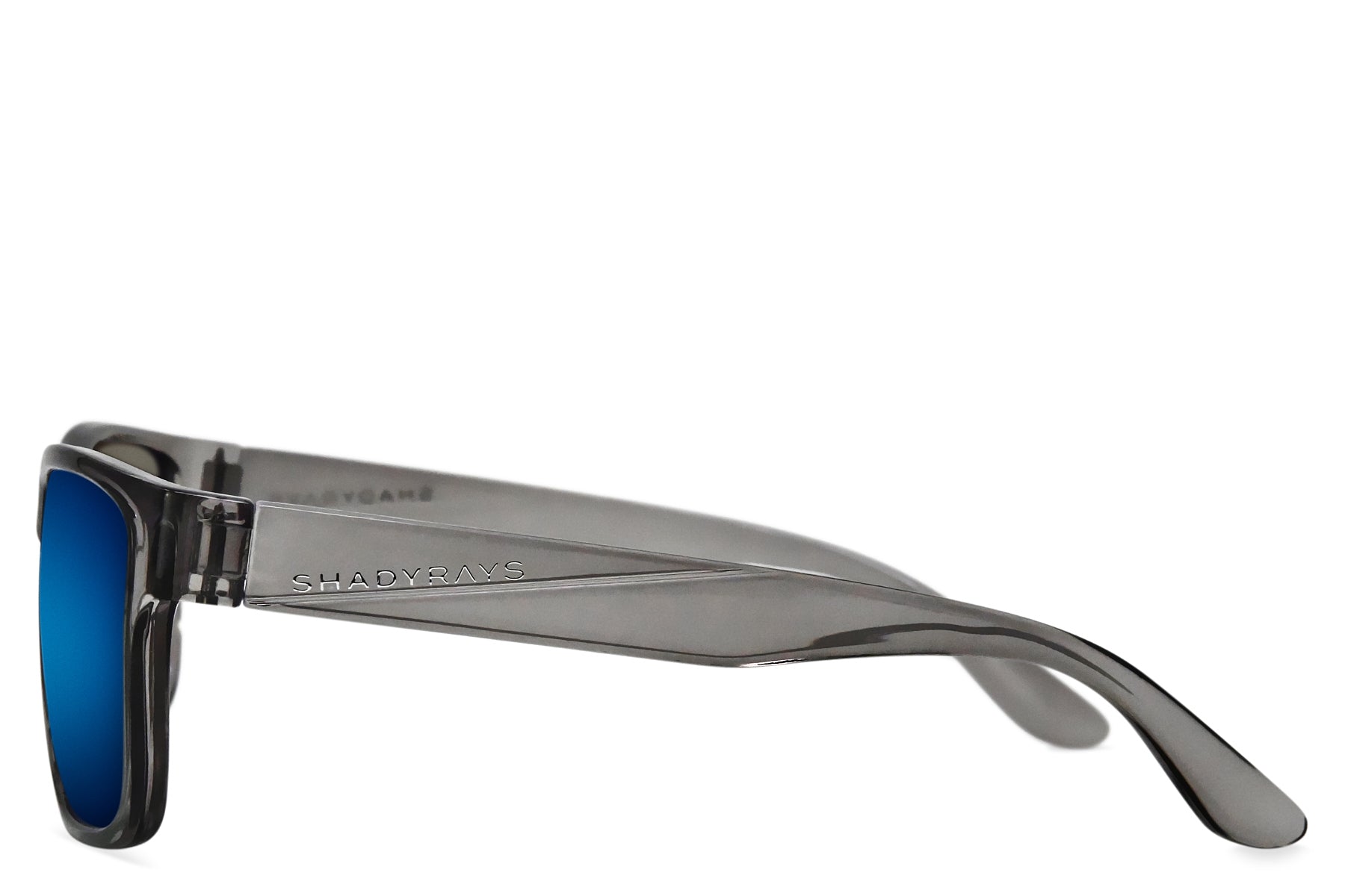 - Transparent grey gloss frame with interlocking hinges and inset metal Shady Rays logo